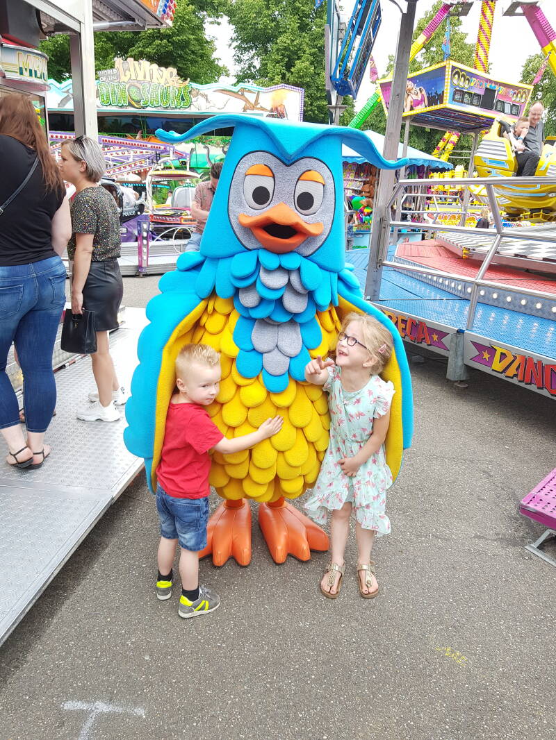 Kermis. Bij het woord kermis denk ik aan attracties , snoepgoed, paling . Jaren geleden de kermis aan het water. De zaterdag dat mijn vader stierf in het pinksterweekend. Maar gisteren en vandaag zijn er weer nieuwe herinneringen bij gekomen. De ontmoeting met Meneer de Uil. De grote wijze uil. Waar Britt vanaf het moment dat ze hem zag op af vloog. De wachtrij voorbij. En zich stortte in zijn vleugels. Ik als een dolle Koen uit de wagen heb gehaald. Erbij gezet. Foto's gemaakt . De kinderen nog net niet onder mijn arm gepakt. En snel van de wachtrij weggelopen. Ik moet zo snel als een flits hebben gewerkt want niemand reageerde. Maar de foto's hebben we weer. Daarna nog in de buggy's en in de carrousel. Daar viel het kaartje van Britt natuurlijk tussen de planken wat een hoop tranen opleverde. De uitbater kwam al een nieuw kaartje brengen. Die waren de tranen en paniek natuurlijk ook opgevallen. Vandaag zijn we geen kaartjes verloren. Hebben we netjes op ons beurt gewacht. Zijn er angsten overwonnen. Hebben we zelfs meer kaartjes gekregen dan dat we betaald hebben. Werden er genoeg touwtjes getrokken. En liepen we met zn vieren naar huis waarvan 2 kinderen trots naar hun kermis kadootjes staarden. En wij genieten van hun stralende gezichtjes. 😍😍