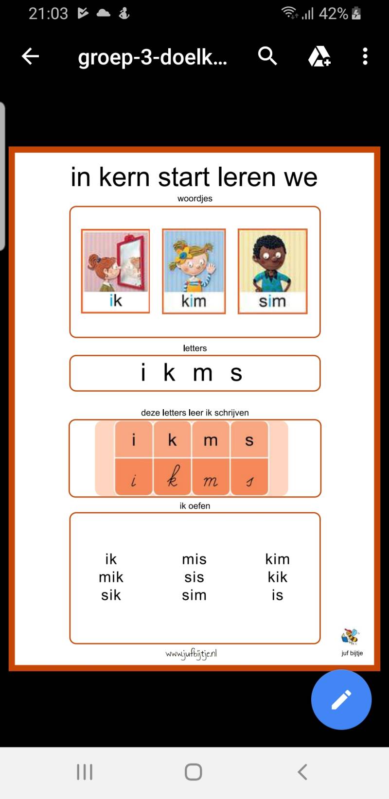 De K,M,S en de i zijn al geleerd. En vol enthousiasme werd me dat na school in de klas voorgelezen door Britt en haar vriendinnetje Lotte . Wat gaat dat snel ineens. Britt die in groep 3 zit en ineens een grote meisjes uitstraling in alles begint te krijgen. Weg kleuter fase. Welkom brutaalheid. Ze heeft ook nog andere woorden geleerd . Waar ik afgelopen week om 6.30 uur van wakker schrok. Een hoop gestommel op de zolder gezucht en nog meer gezucht en zelfs gemopper. Britt stuift naar beneden en met een knal vliegt haar deur dicht en gaat ze weer in haar bed liggen. Even later zijn we samen op de badkamer. Britt al helemaal aangekleed. Ik vraag waarom was je zo boos. Nu ik in groep 3 zit, moet ik zelfstandig kunnen werken. Dus ook dat keukentje in elkaar zetten. En ook zelfstandig alles leren. Slik weer een loslaat momentje. Gisteravond had ze weer zwemles. Een moment van trots trok door me heen van kop tot teen. Toen Britt helemaal alleen in het water dook. Onderweg naar huis huppelt ze langs me. Britt wat heb je dat duiken supergoed gedaan. Ja mam. Dat komt omdat ik zelfvertrouwen had. Ik zei voordat ik dook. Britt zet je zelfvertrouwen aan en zie je mam het heeft geholpen. Haha. Mijn lach heb ik moeten inhouden, maar meisje blijf je zelfvertrouwen vooral aanzetten want dan gaat het helemaal goed komen.